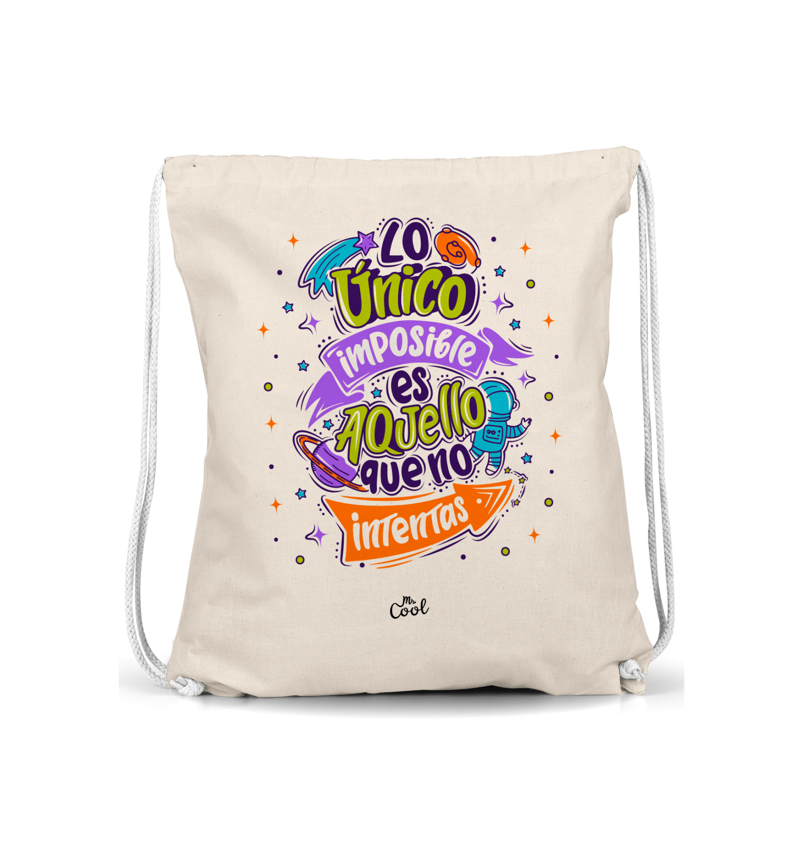 Mochila Saco con frases originales marca Mr. Cool, fabricado en 100% poliester tipo lino, tacto suave.