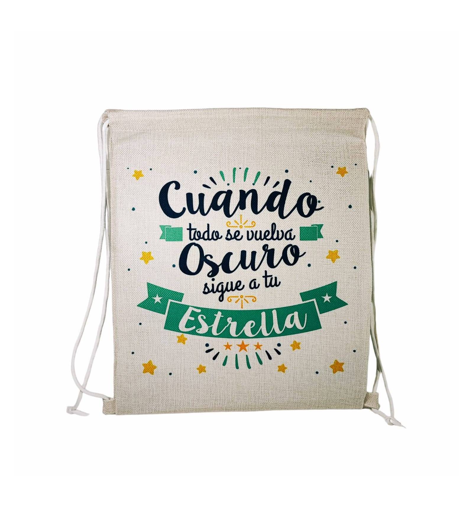 Mochila Saco con frases originales marca Mr. Cool, fabricado en 100% poliester tipo lino, tacto suave.