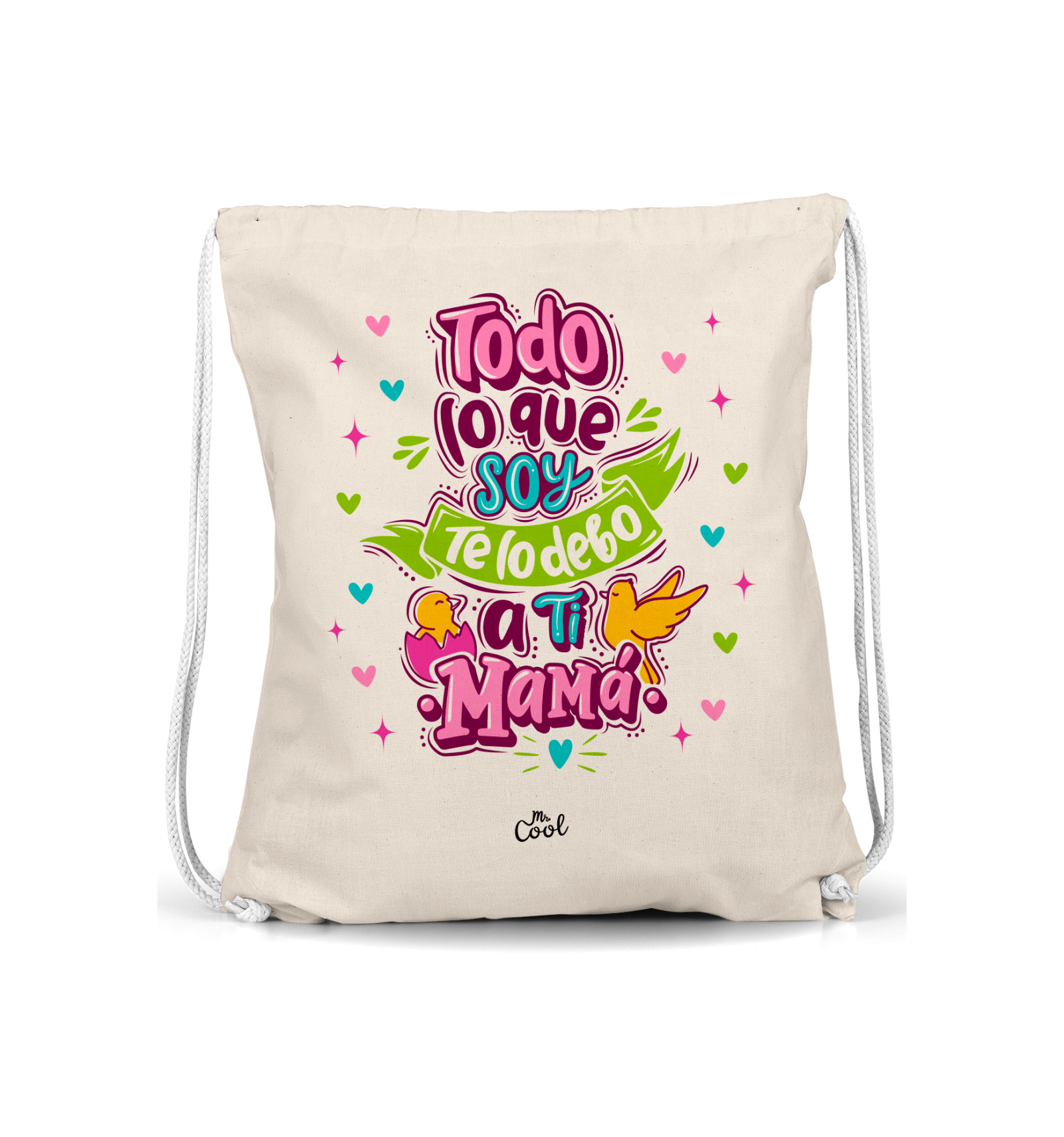 Mochila Saco con frases originales marca Mr. Cool, fabricado en 100% poliester tipo lino, tacto suave.