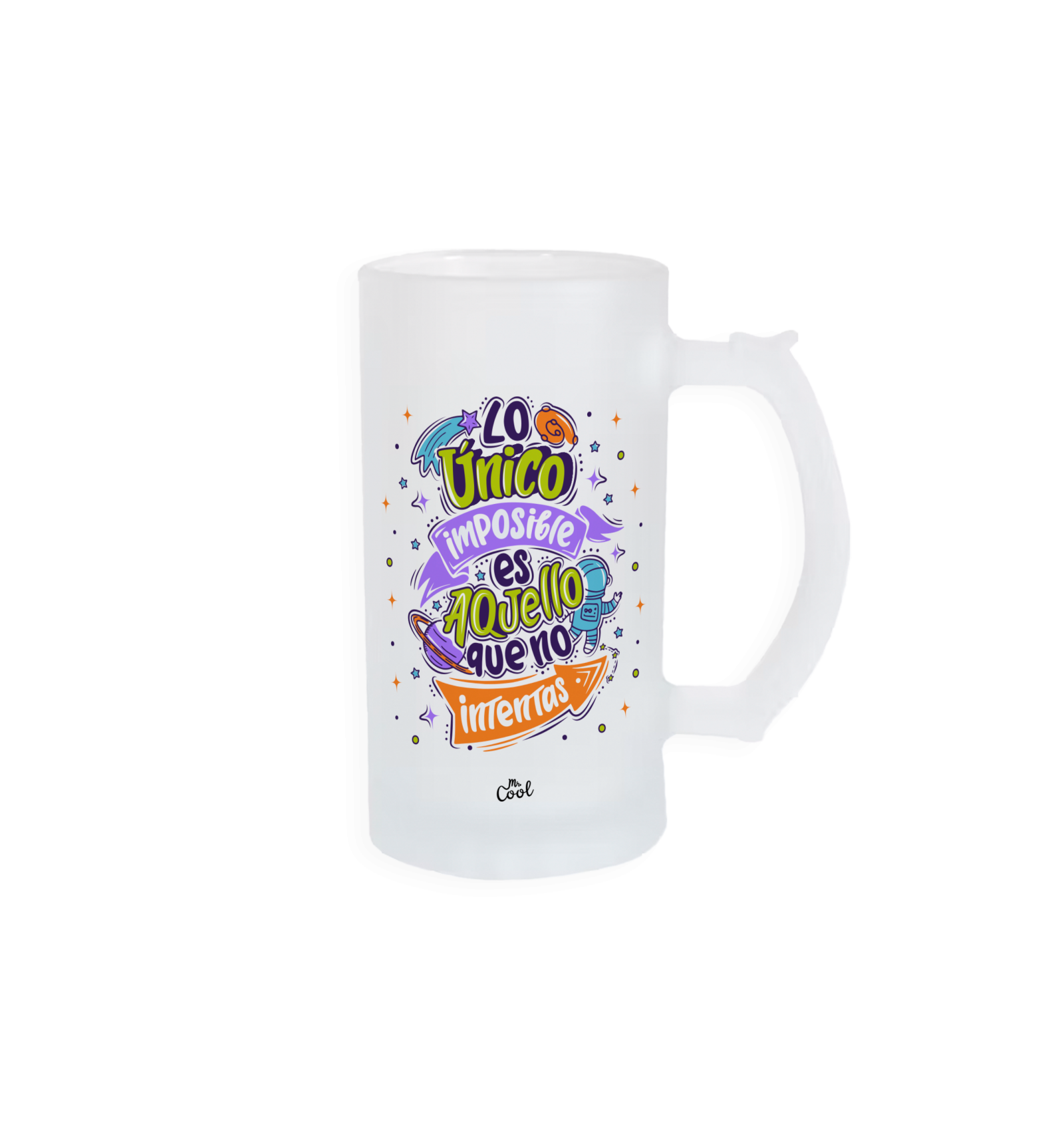JARRA cristal opaco o esmerilado con frases originales marca Mr. Cool, apta para microondas y lavavajillas. Y podrás meter la taza sin liquidos en el congelador para tener bebidas muy frias.