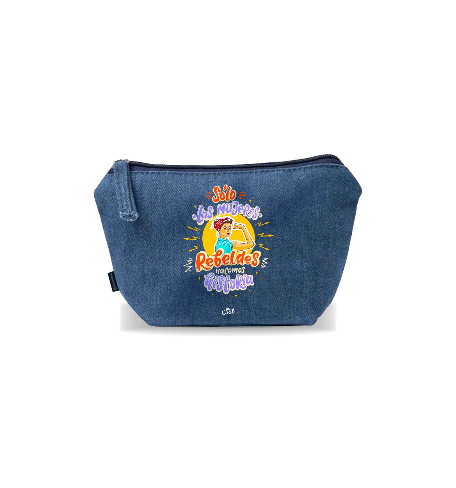 Neceser con frases originales marca Mr. Cool, fabricado en vaquero reciclado de 320 gr/m², tacto suave.