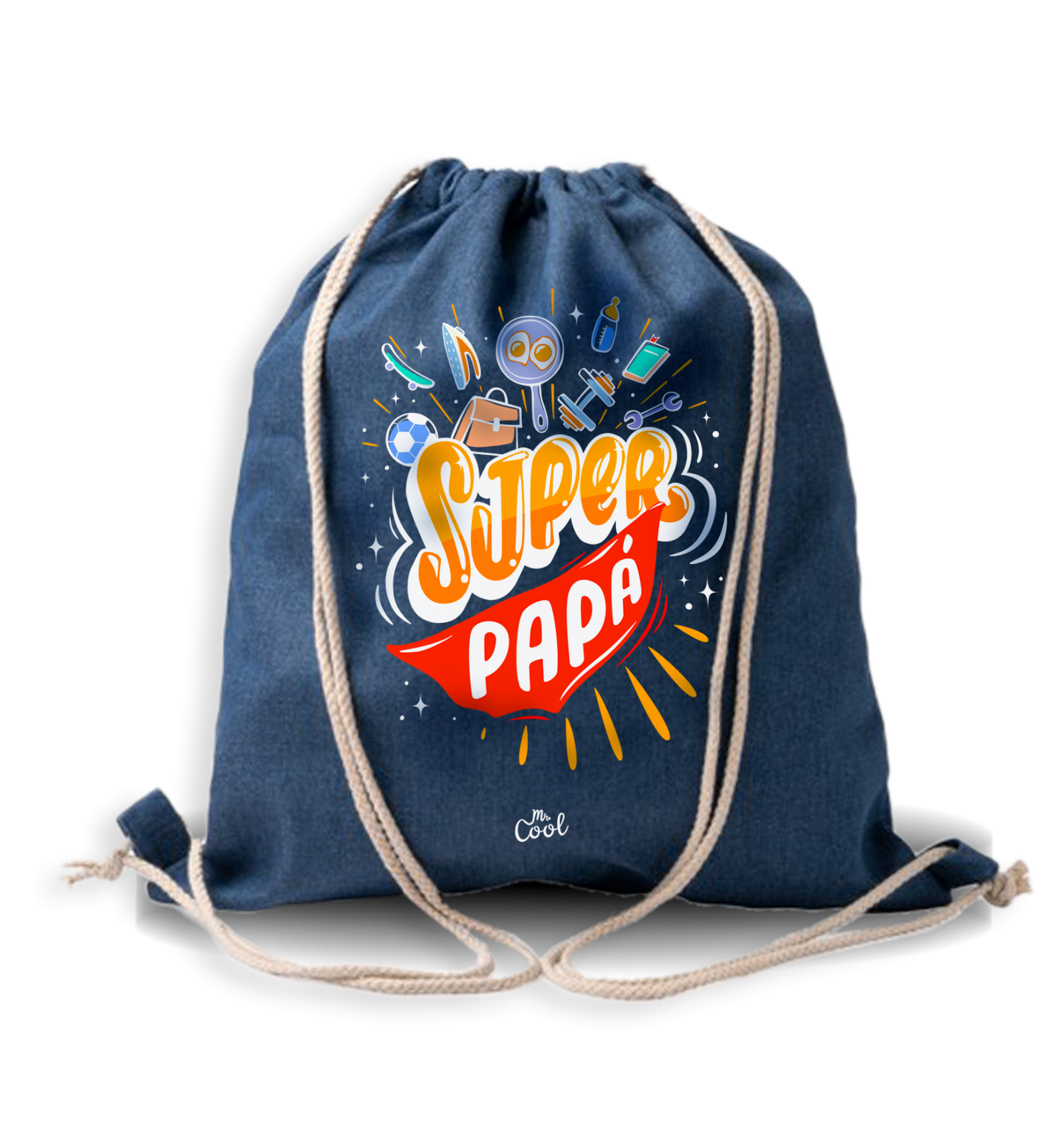 Mochila Saco con frases originales marca Mr. Cool, fabricado en vaquero reciclado de 320 gr/m², tacto suave.