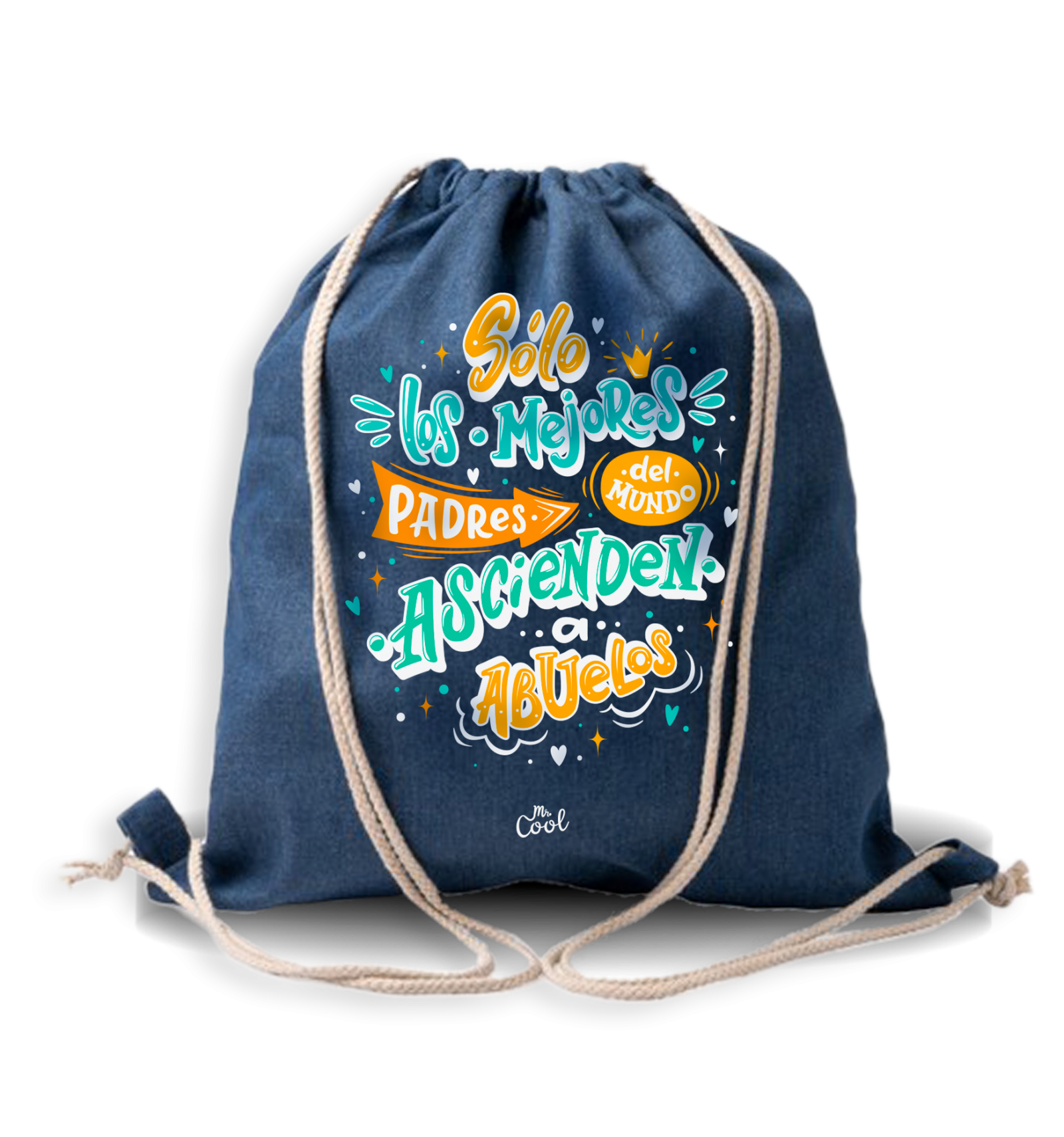 Mochila Saco con frases originales marca Mr. Cool, fabricado en vaquero reciclado de 320 gr/m², tacto suave.