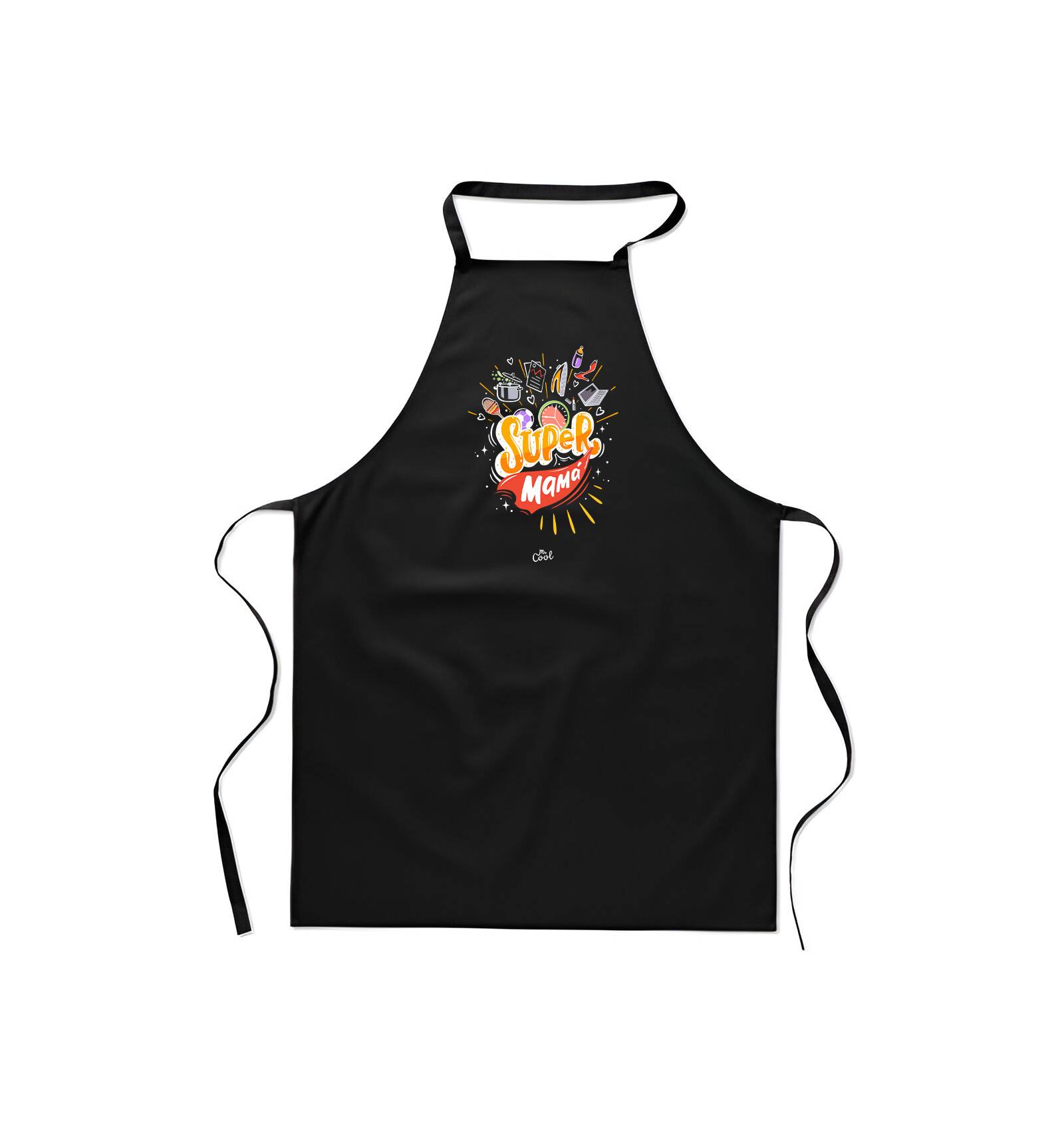 Delantal negro con frases originales marca Mr. Cool, fabricado en 80% poliester 20% algodon.