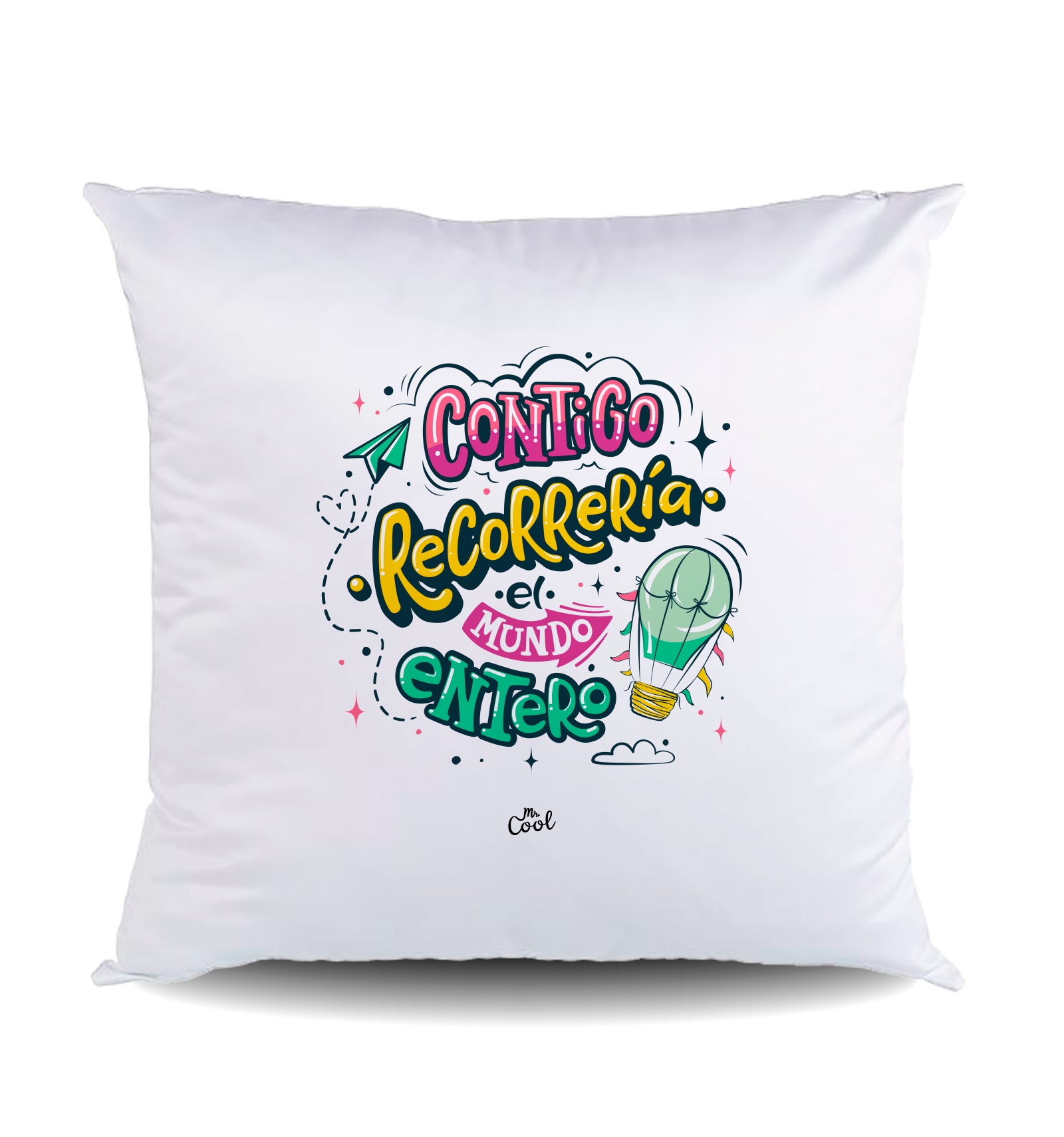 Cojín cuadrado con frases originales marca Mr. Cool, fabricado en España.