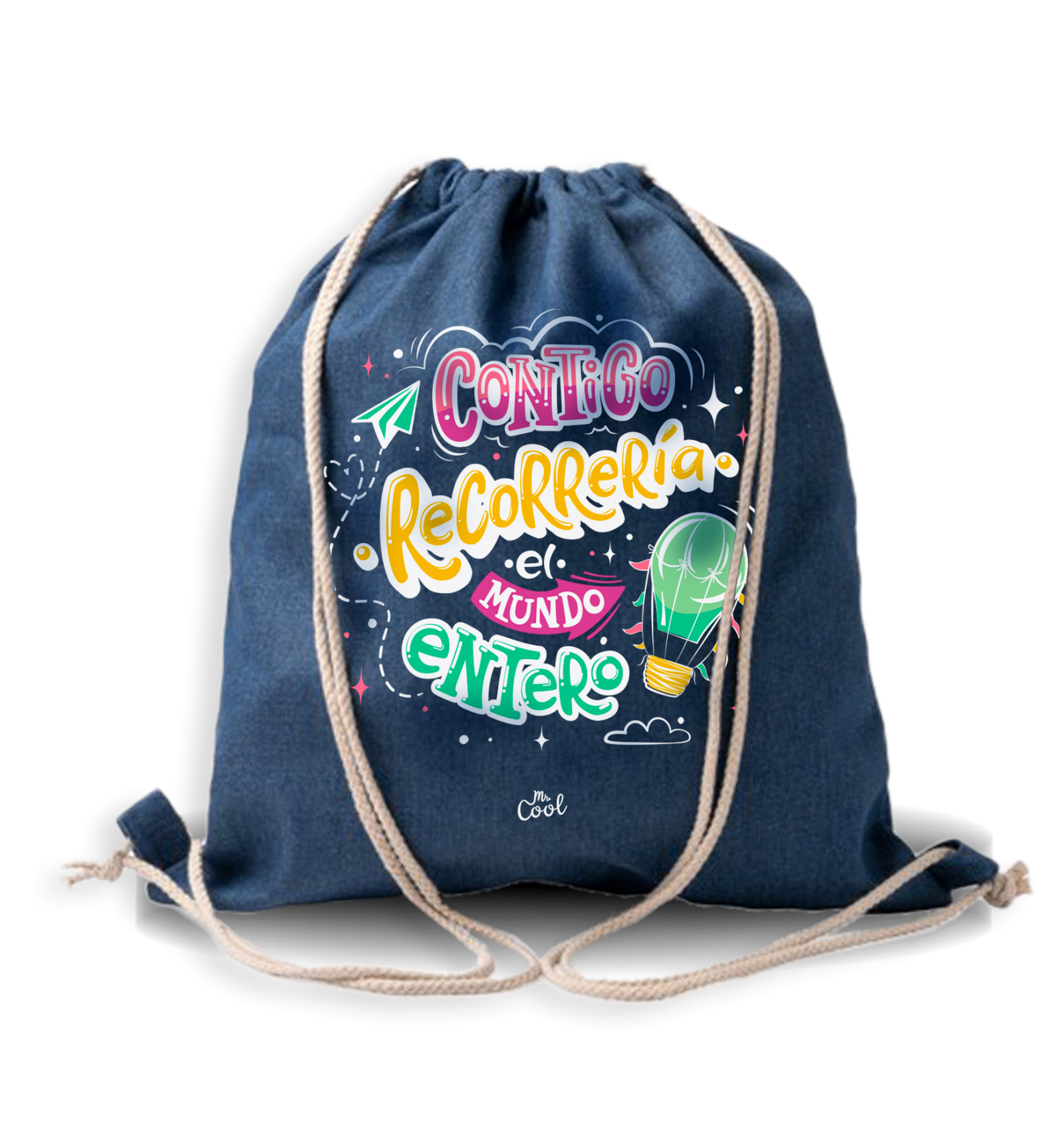 Mochila Saco con frases originales marca Mr. Cool, fabricado en vaquero reciclado de 320 gr/m², tacto suave.