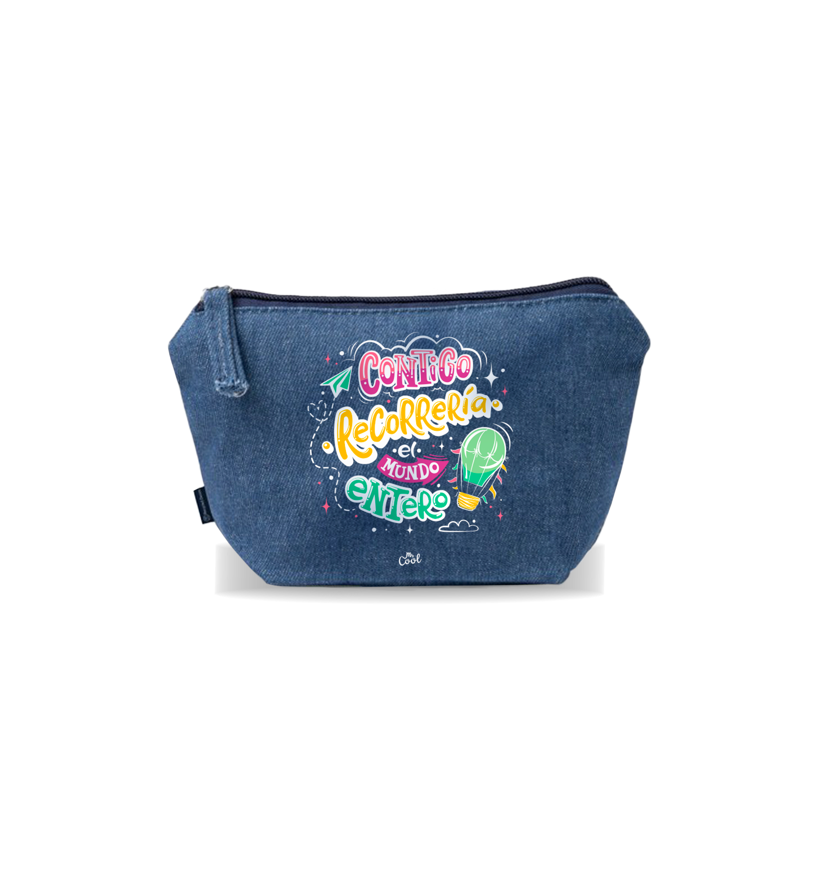 Neceser con frases originales marca Mr. Cool, fabricado en vaquero reciclado de 320 gr/m², tacto suave.