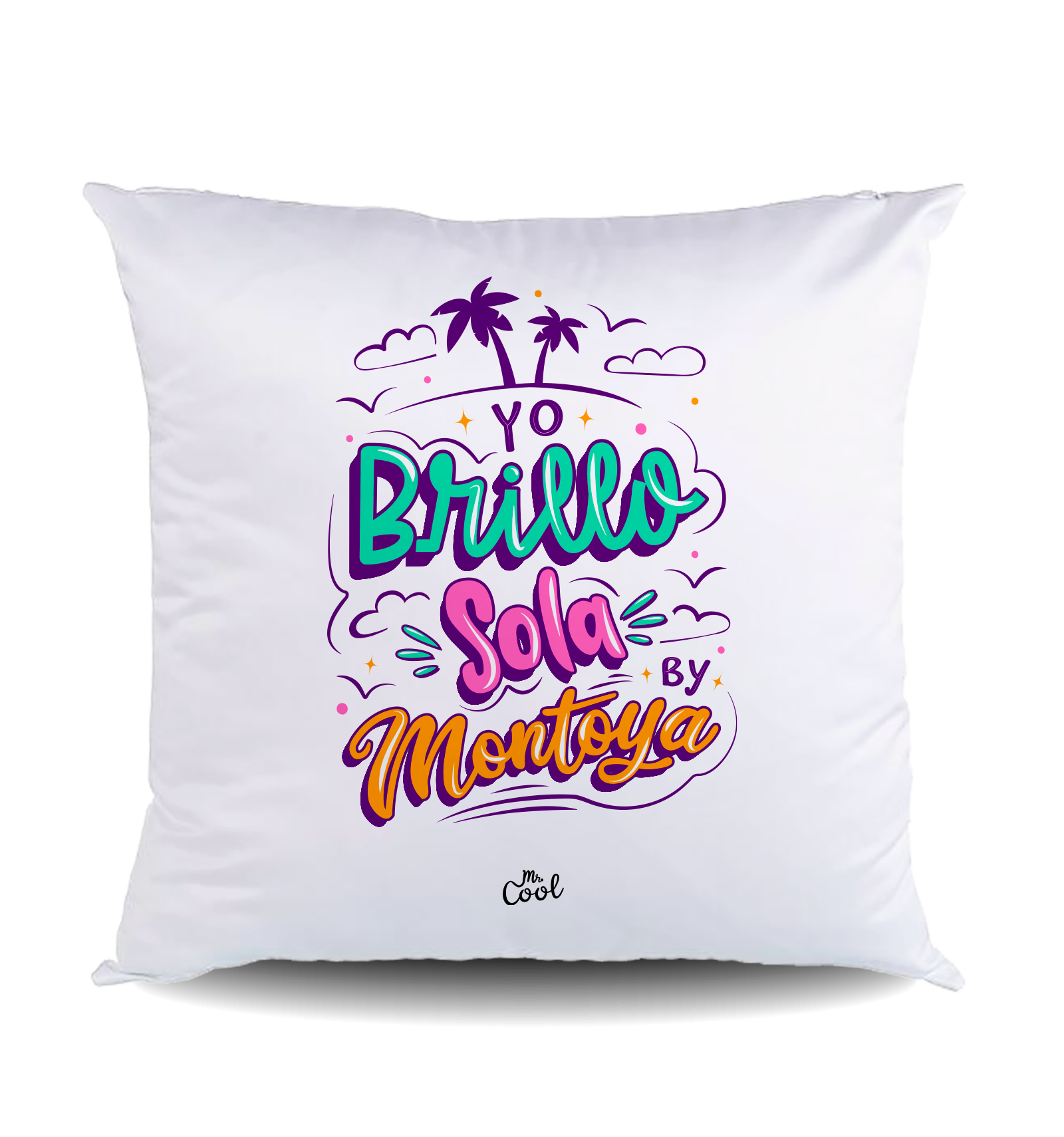 Cojín cuadrado con frases originales marca Mr. Cool, fabricado en España.