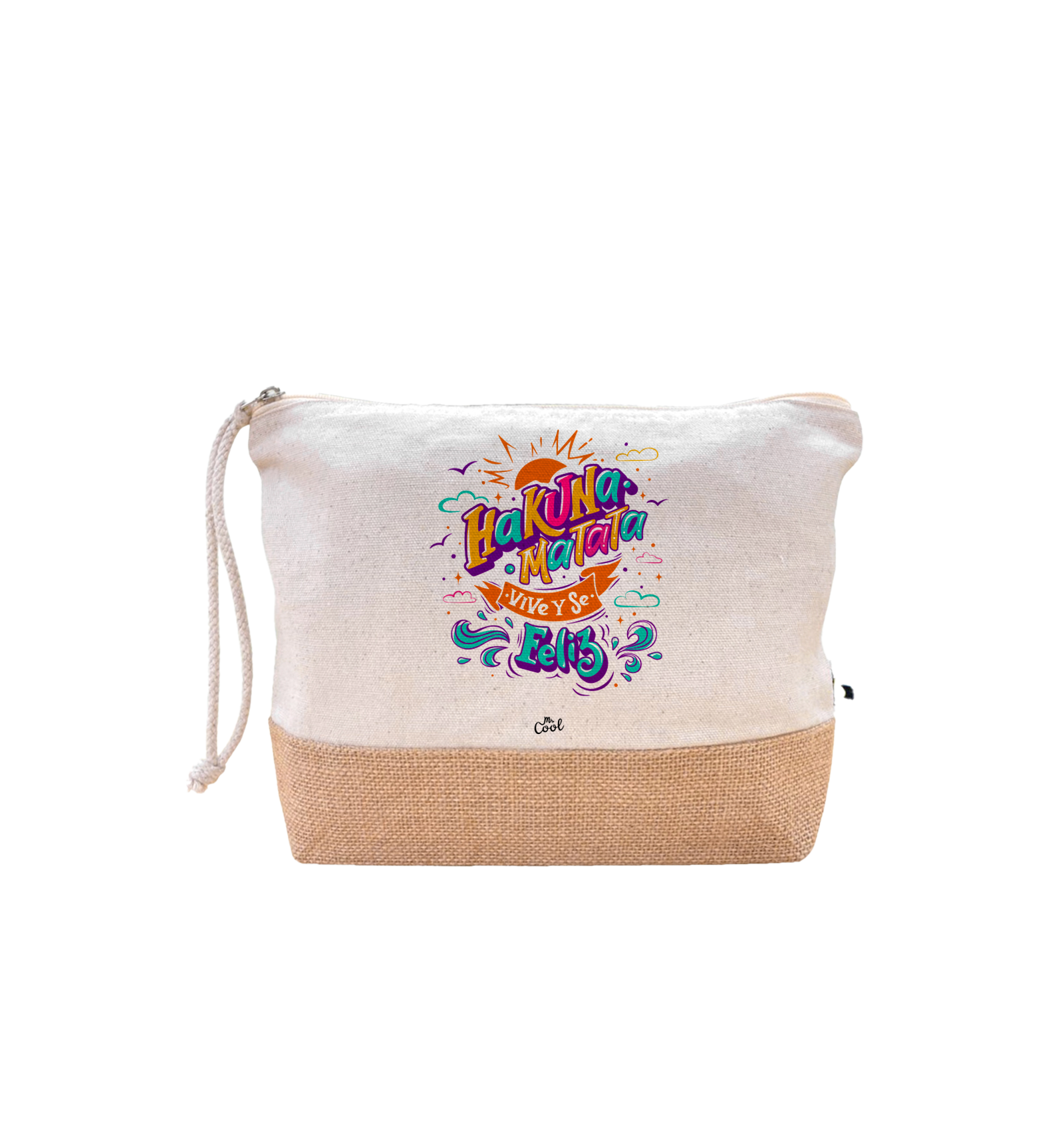 Neceser con frases originales marca Mr. Cool, fabricado en algodón de 220g/m² con base de yute y asa larga