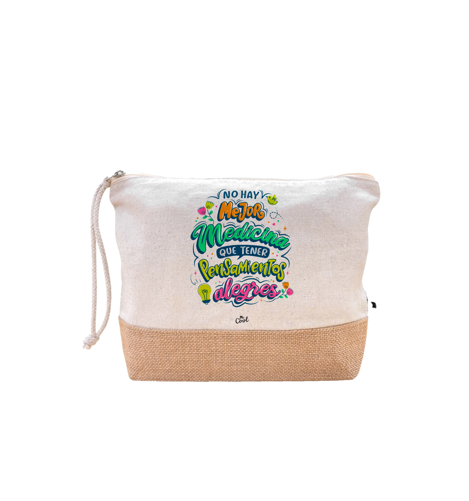 Neceser con frases originales marca Mr. Cool, fabricado en algodón de 220g/m² con base de yute y asa larga