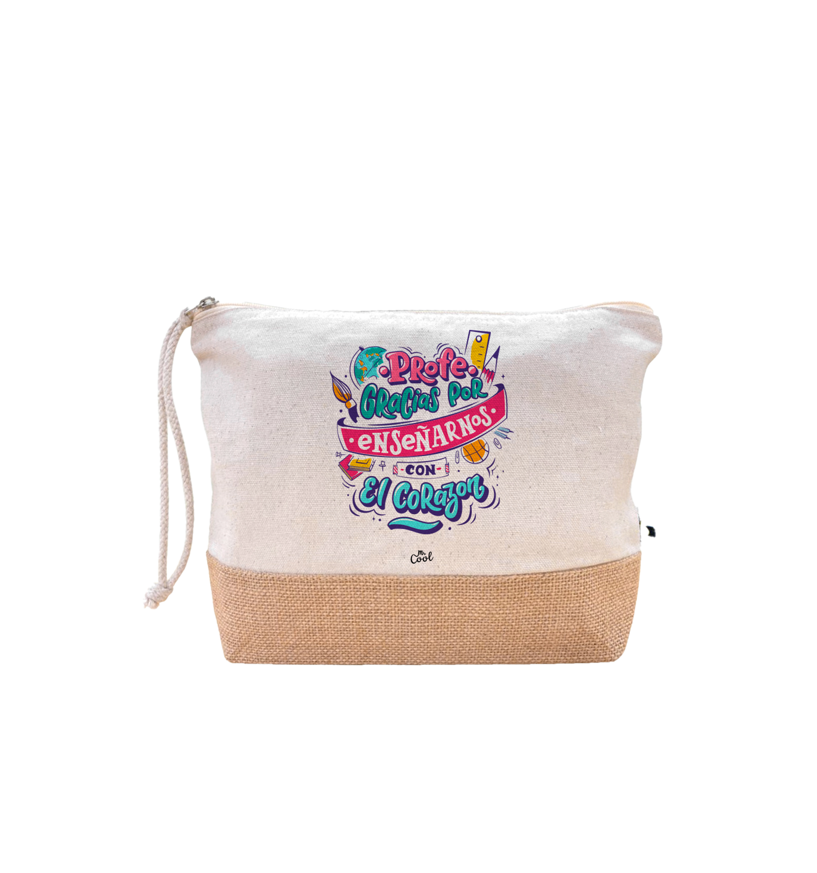 Neceser con frases originales marca Mr. Cool, fabricado en algodón de 220g/m² con base de yute y asa larga