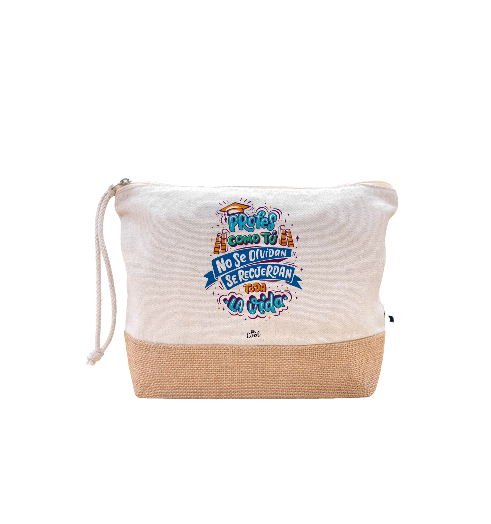 Neceser con frases originales marca Mr. Cool, fabricado en algodón Fairtrade con base de yute y asa.