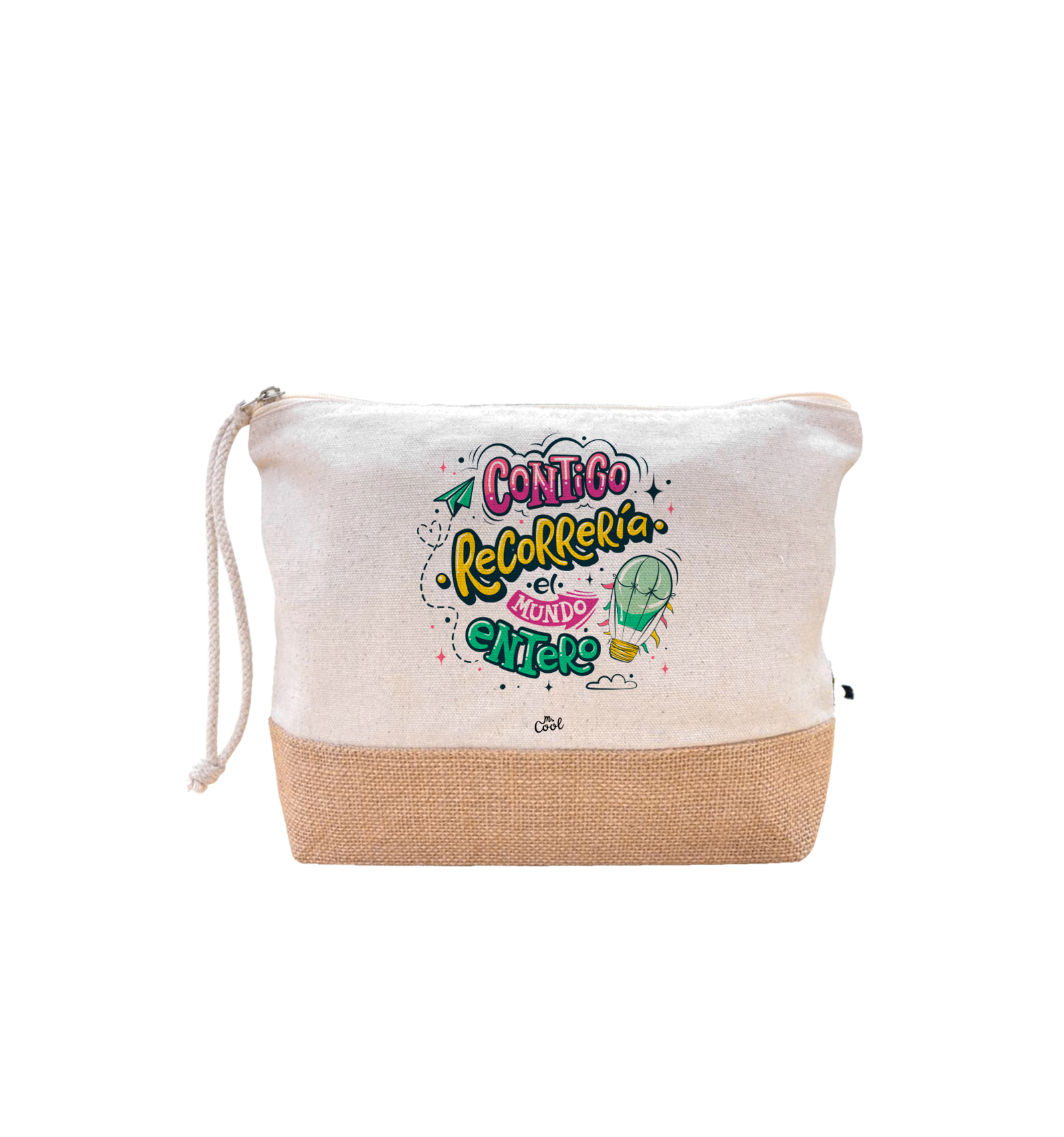 Neceser con frases originales marca Mr. Cool, fabricado en algodón de 220g/m² con base de yute y asa larga