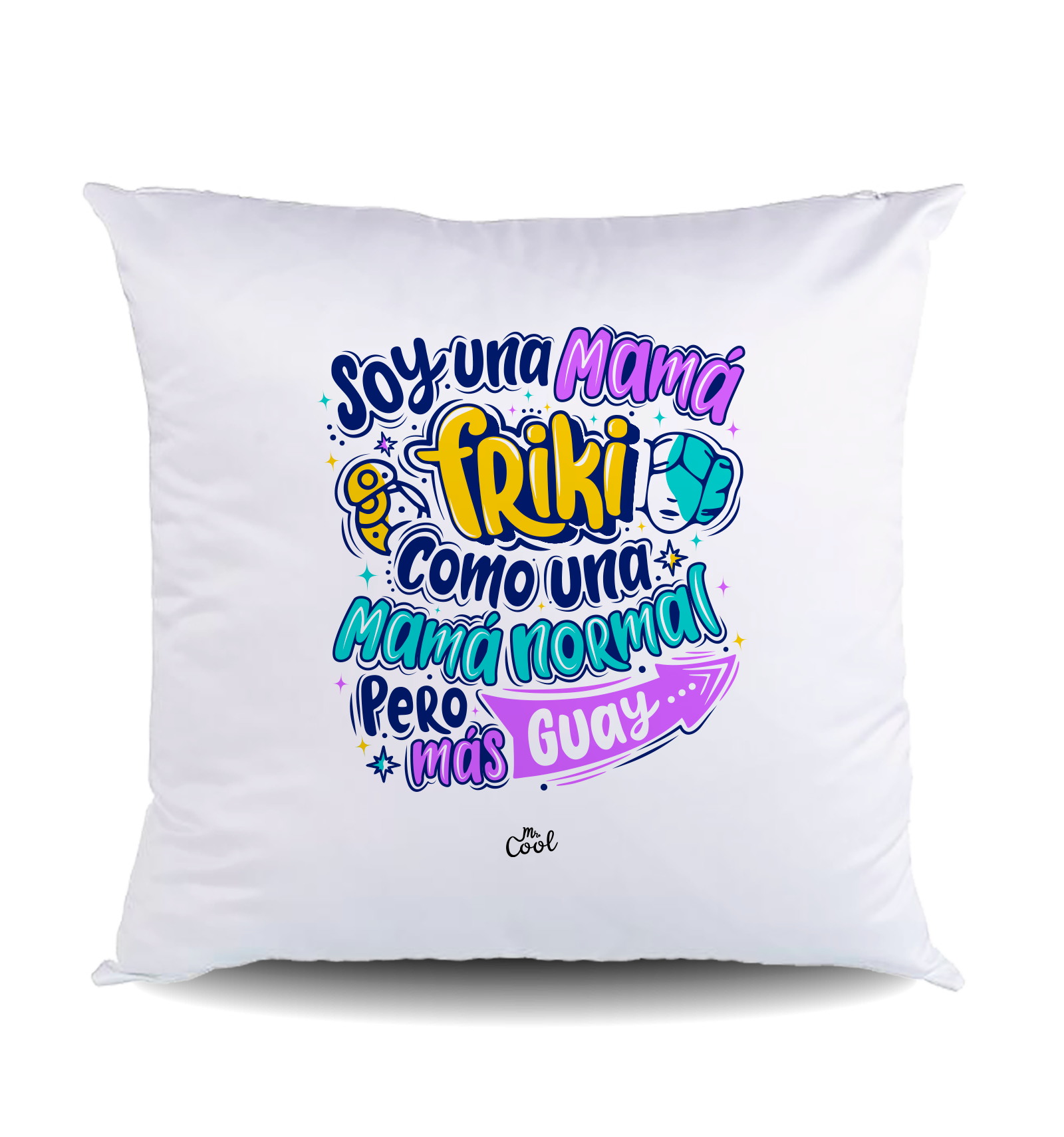 Cojín cuadrado con frases originales marca Mr. Cool, fabricado en España.