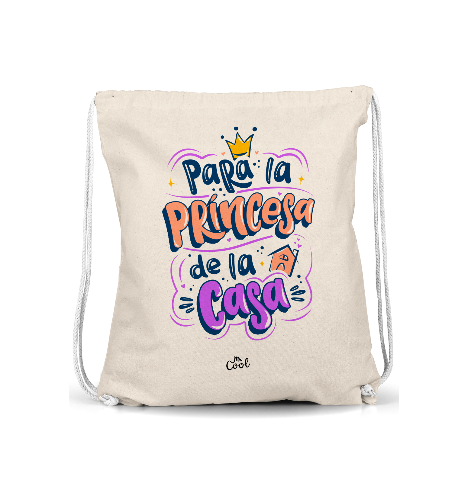 Mochila Saco con frases originales marca Mr. Cool, fabricado en 100% poliester tipo lino, tacto suave.