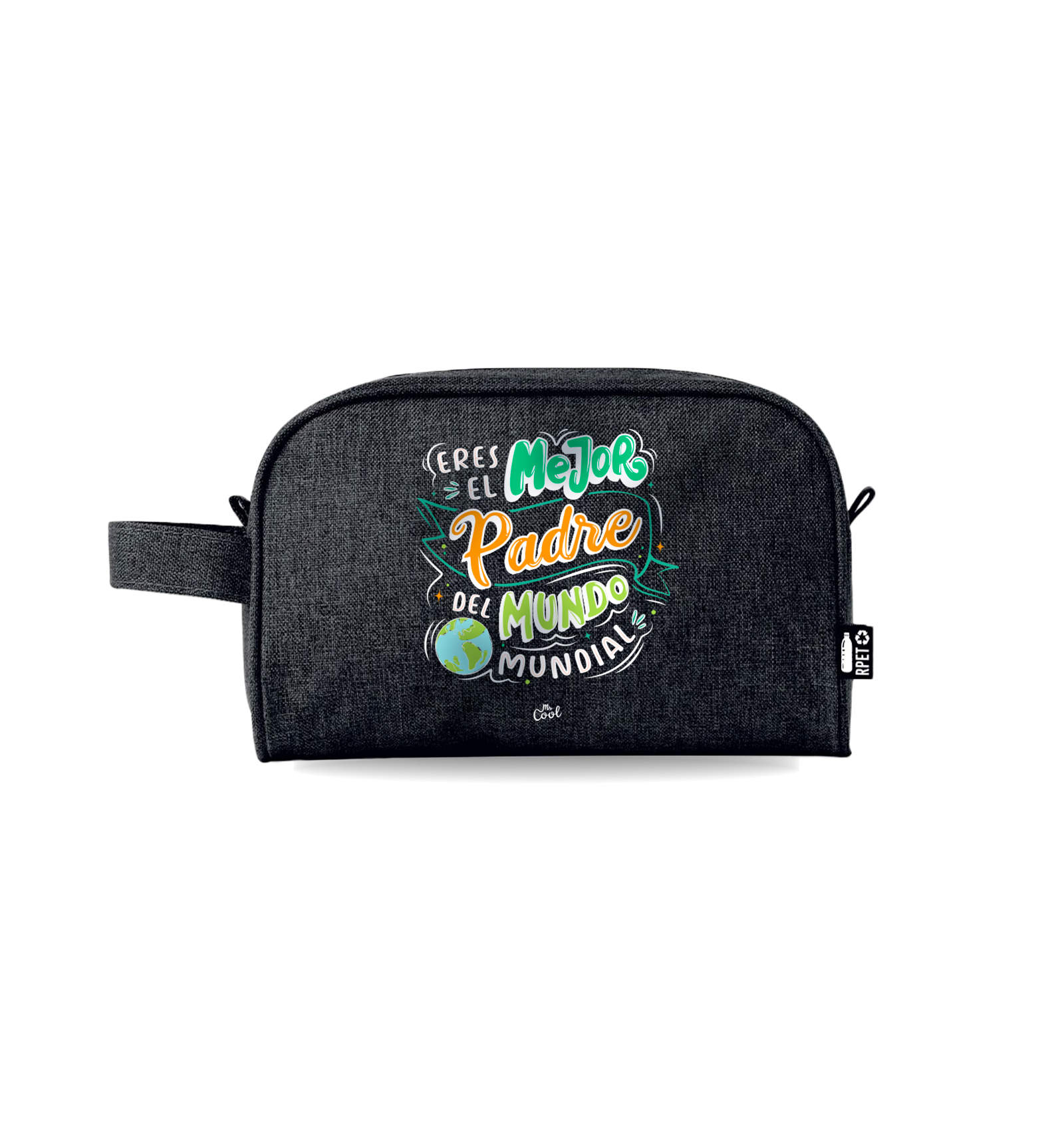 Neceser con frases originales marca Mr. Cool, fabricado en poliéster 600D RPET, color negro.