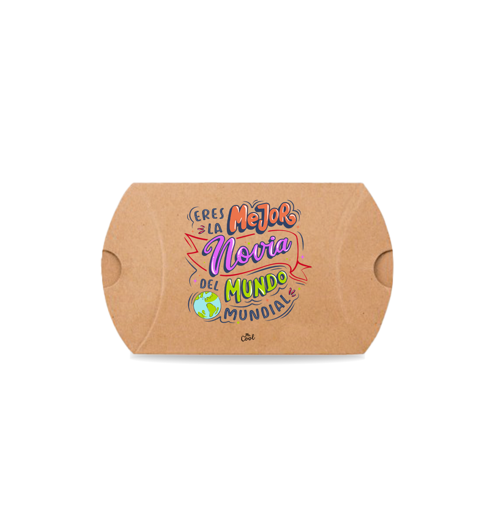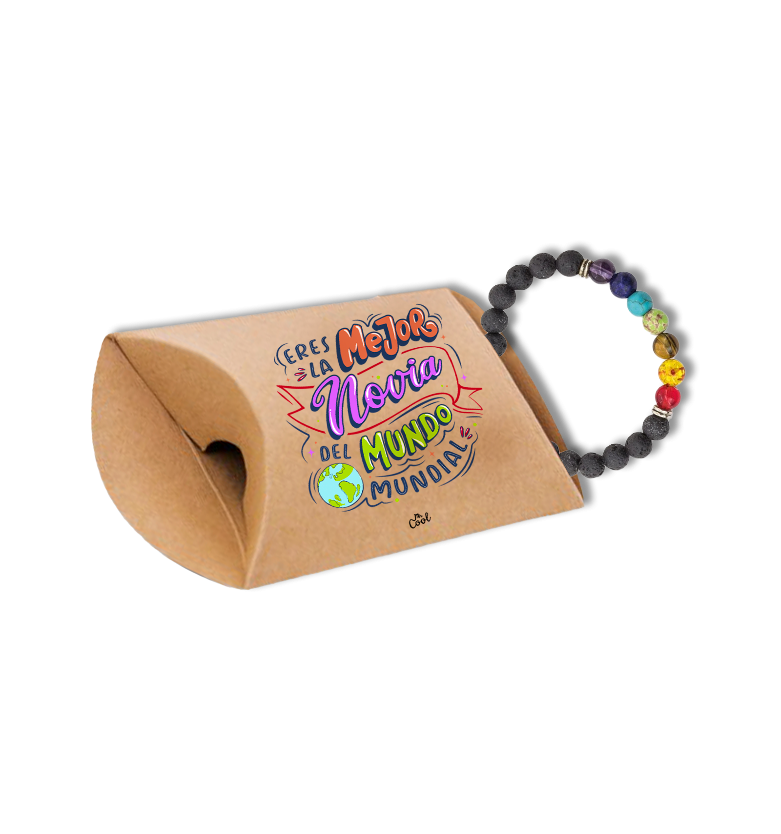 Cajita de cartón para regalo con frases originales marca Mr. Cool, con pulsera piedra volcánica 7 chakras.