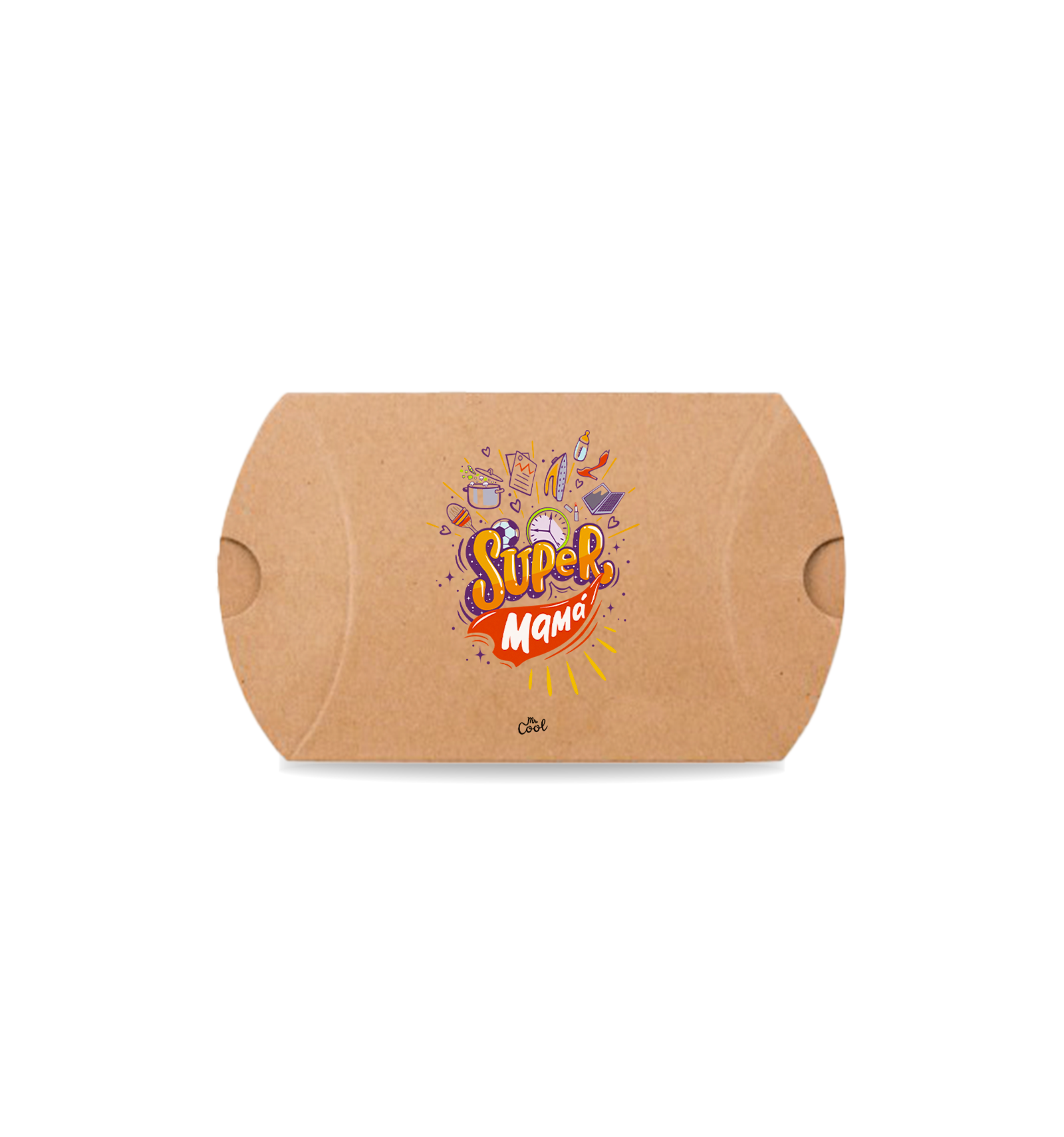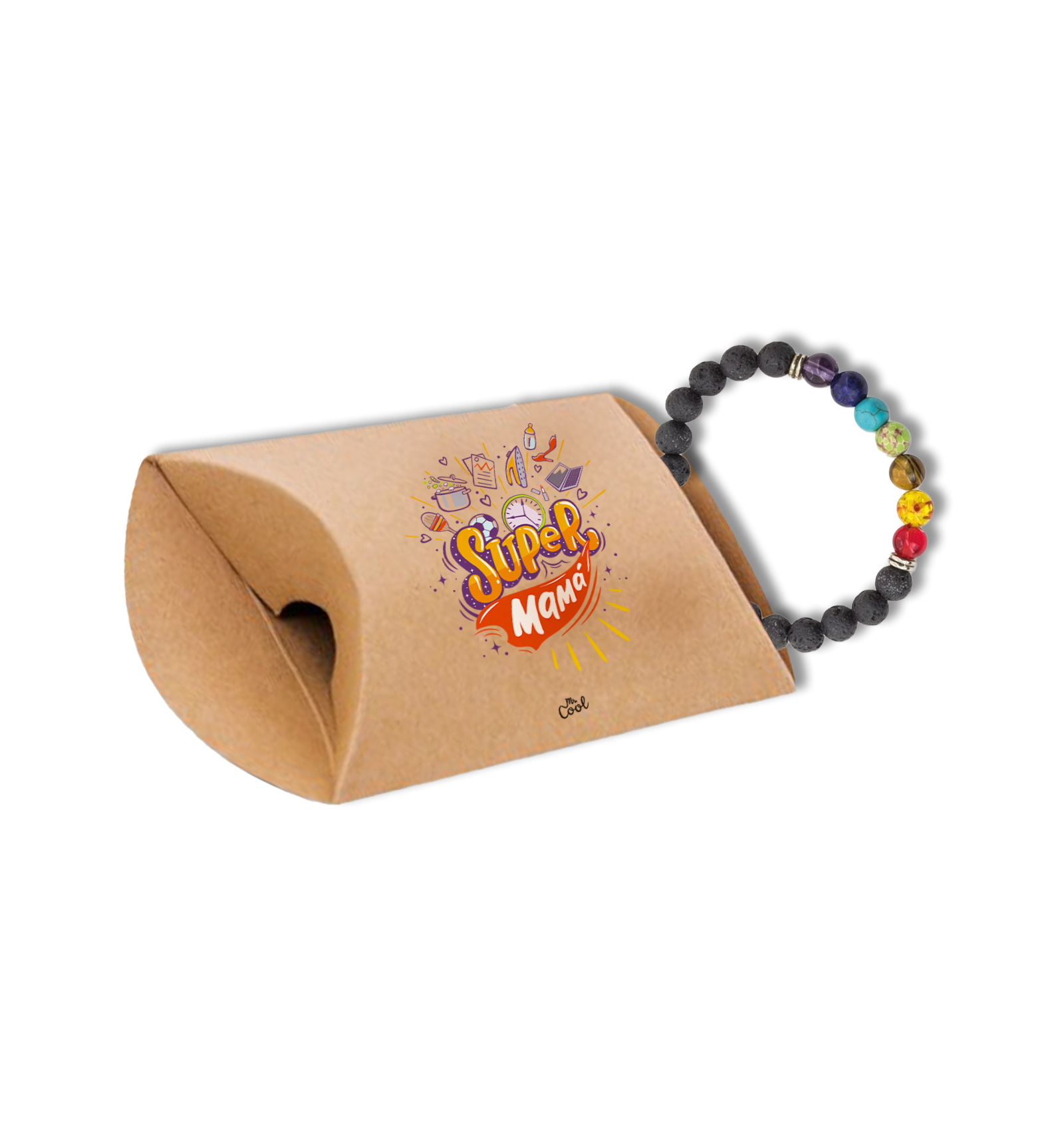 Cajita de cartón para regalo con frases originales marca Mr. Cool, con pulsera piedra volcánica 7 chakras.