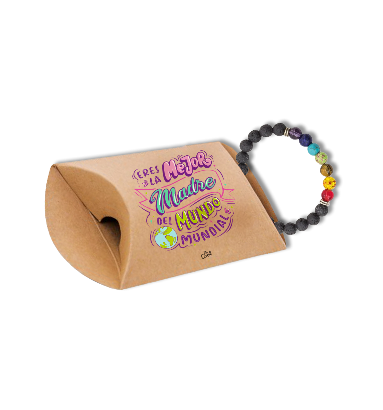 Cajita de cartón para regalo con frases originales marca Mr. Cool, con pulsera piedra volcánica 7 chakras.