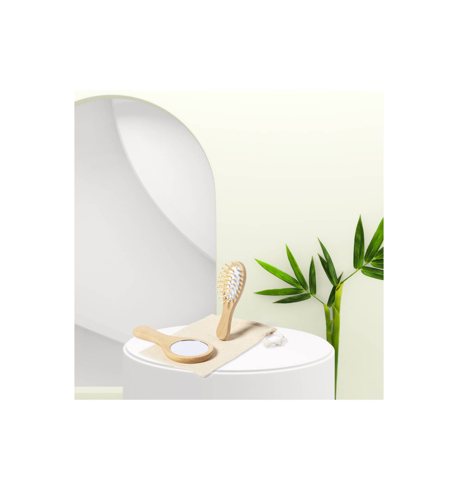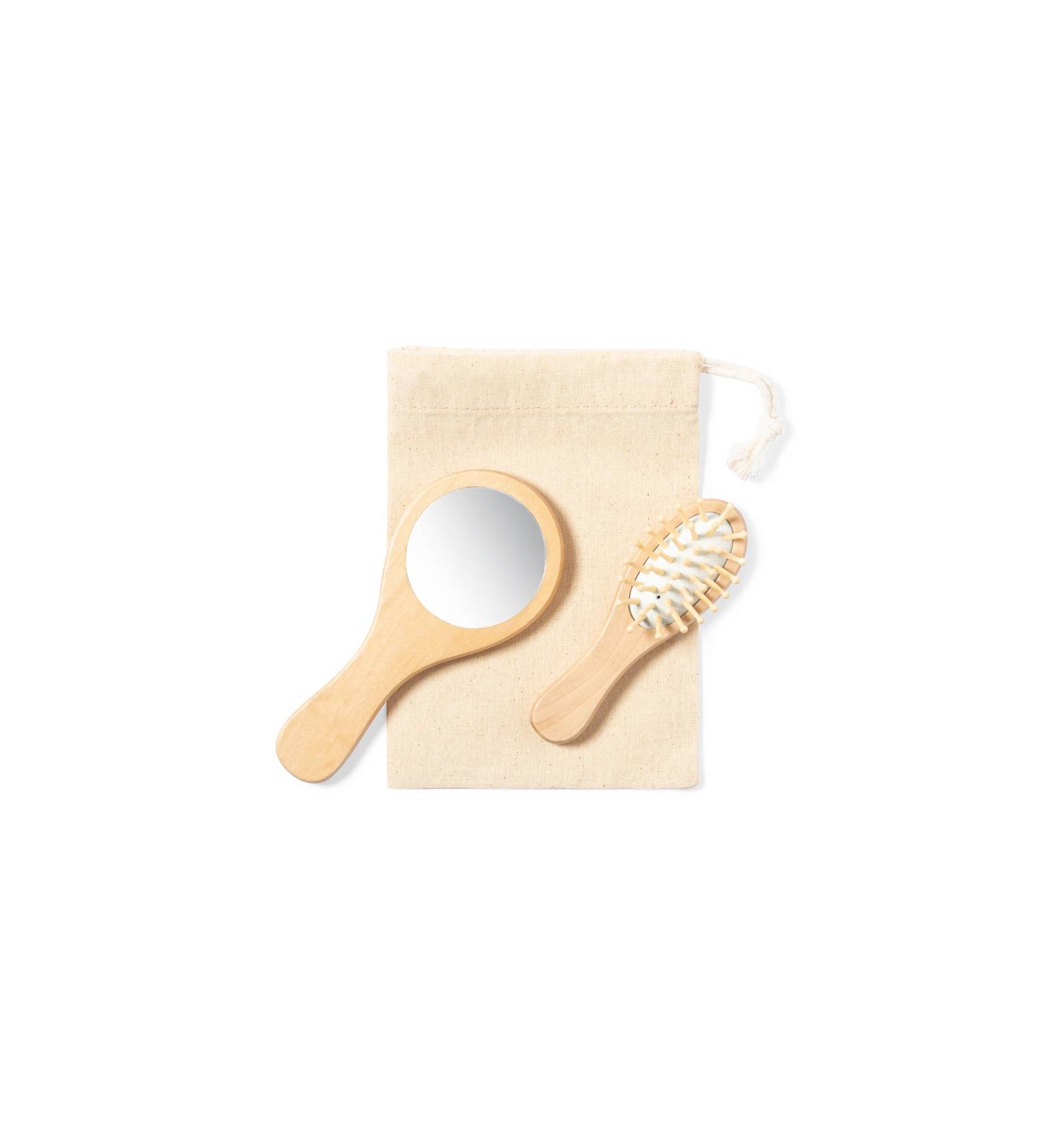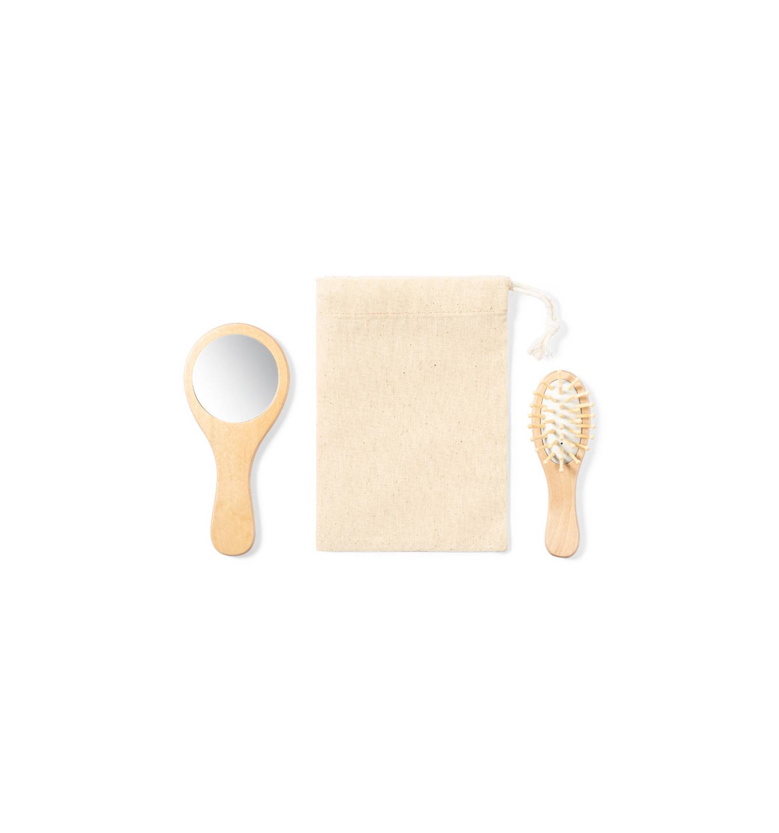 Set compuesto por bolsa algodon, cepillo y espejo en madera personalizable.
