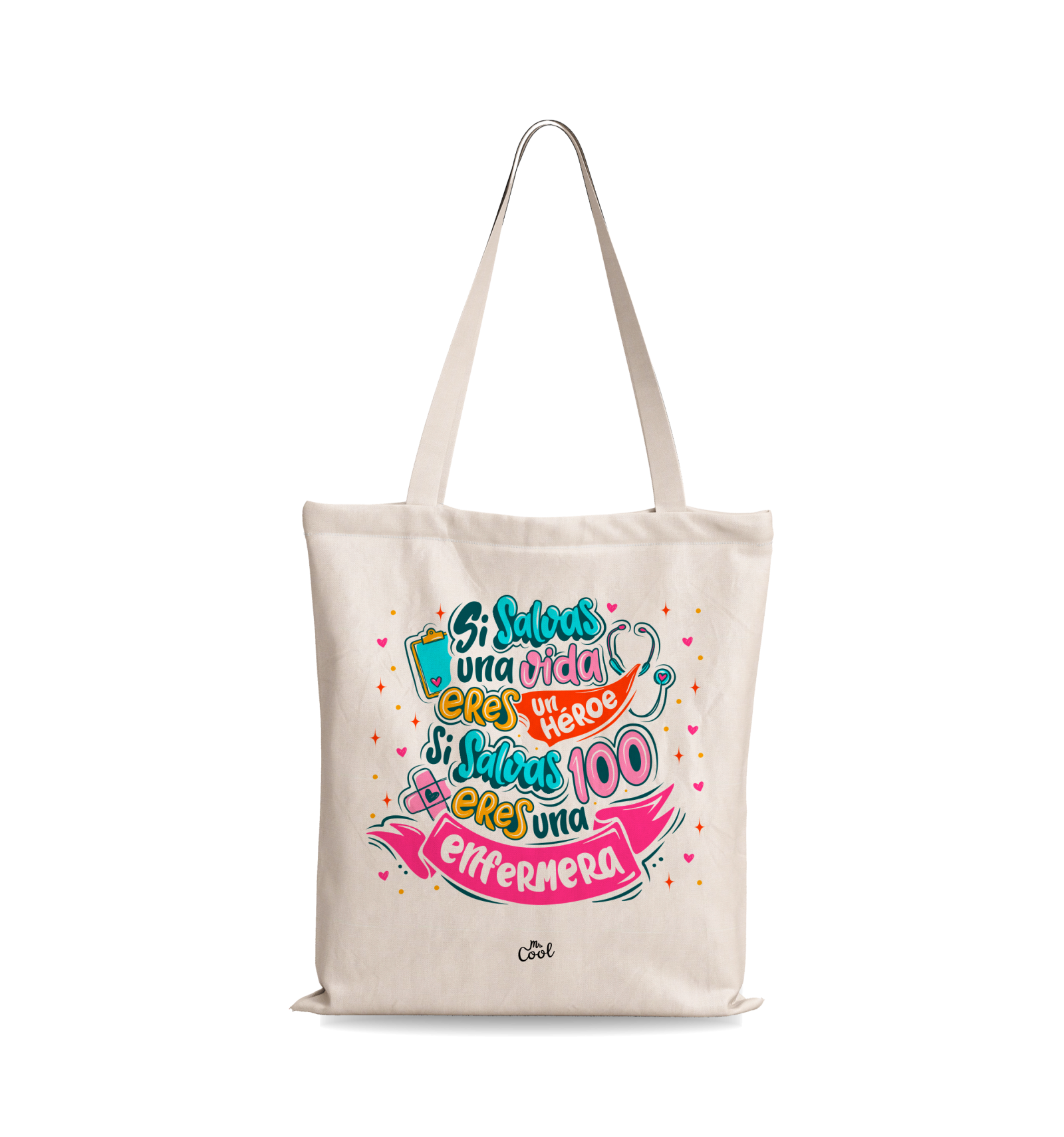 Bolsa Tote Bag con frases originales marca Mr. Cool, fabricado en 100% poliester tipo lino, tacto suave.