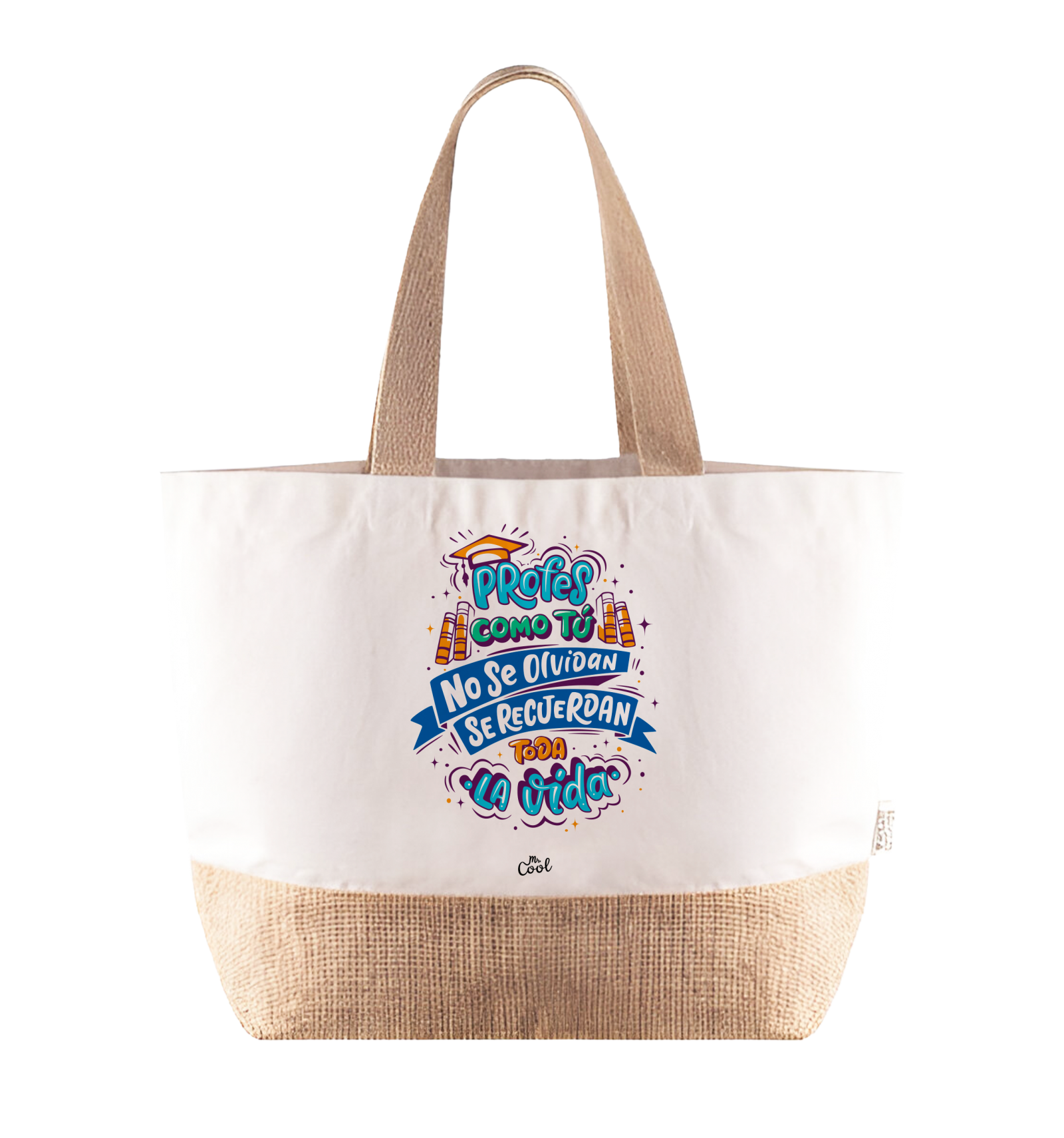Bolsa de asa larga con frases originales marca Mr. Cool, fabricada en algodón de reciclado de 320 gr/m² y base de yute.