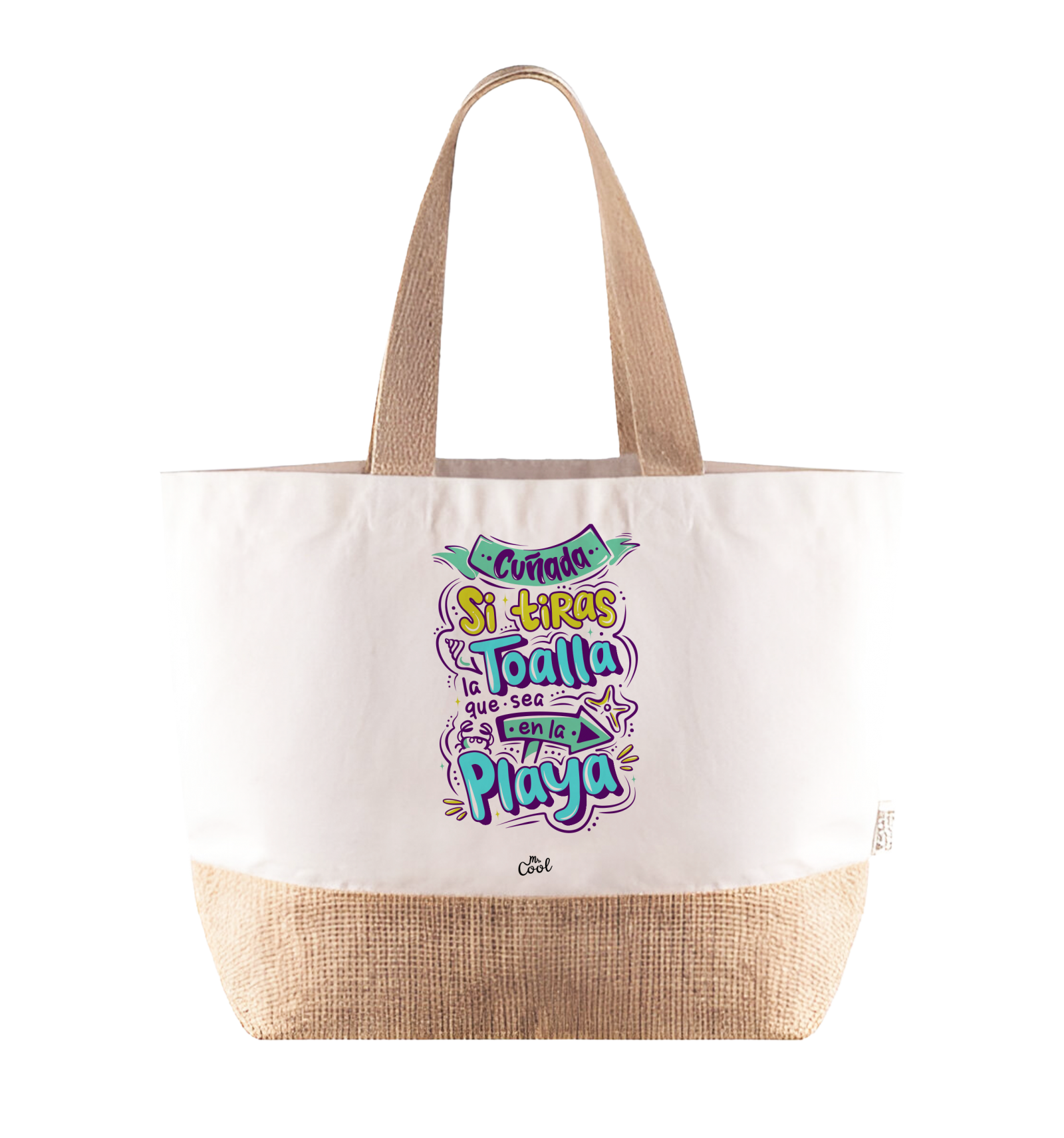 Bolsa de asa larga con frases originales marca Mr. Cool, fabricada en algodón de reciclado de 320 gr/m² y base de yute.