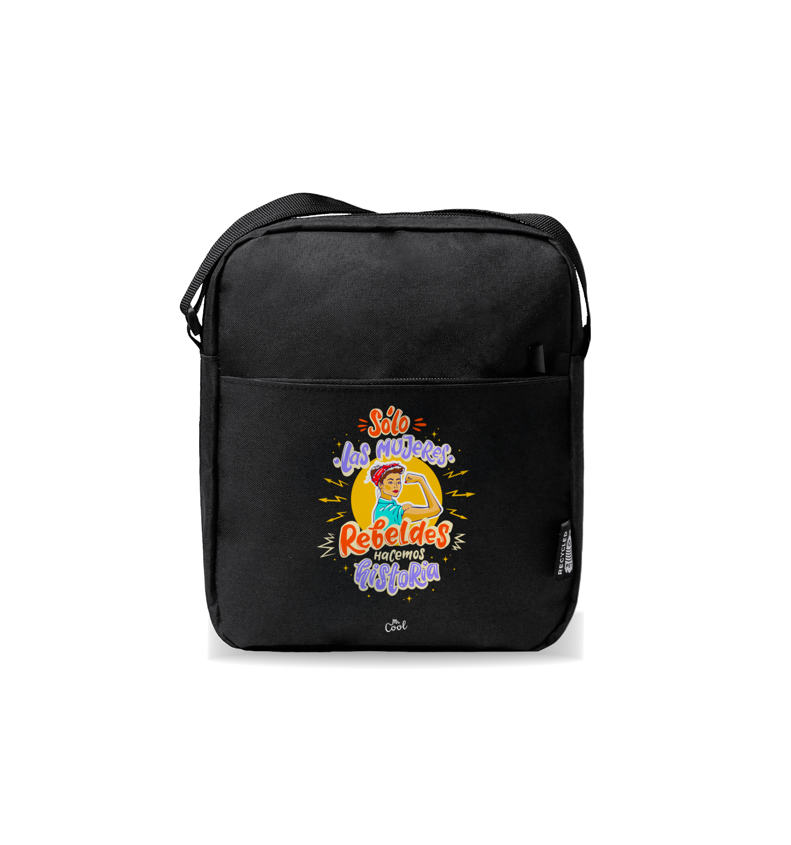 Bandolera negra con frases originales marca Mr. Cool, fabricada en políester reciclado RPET.