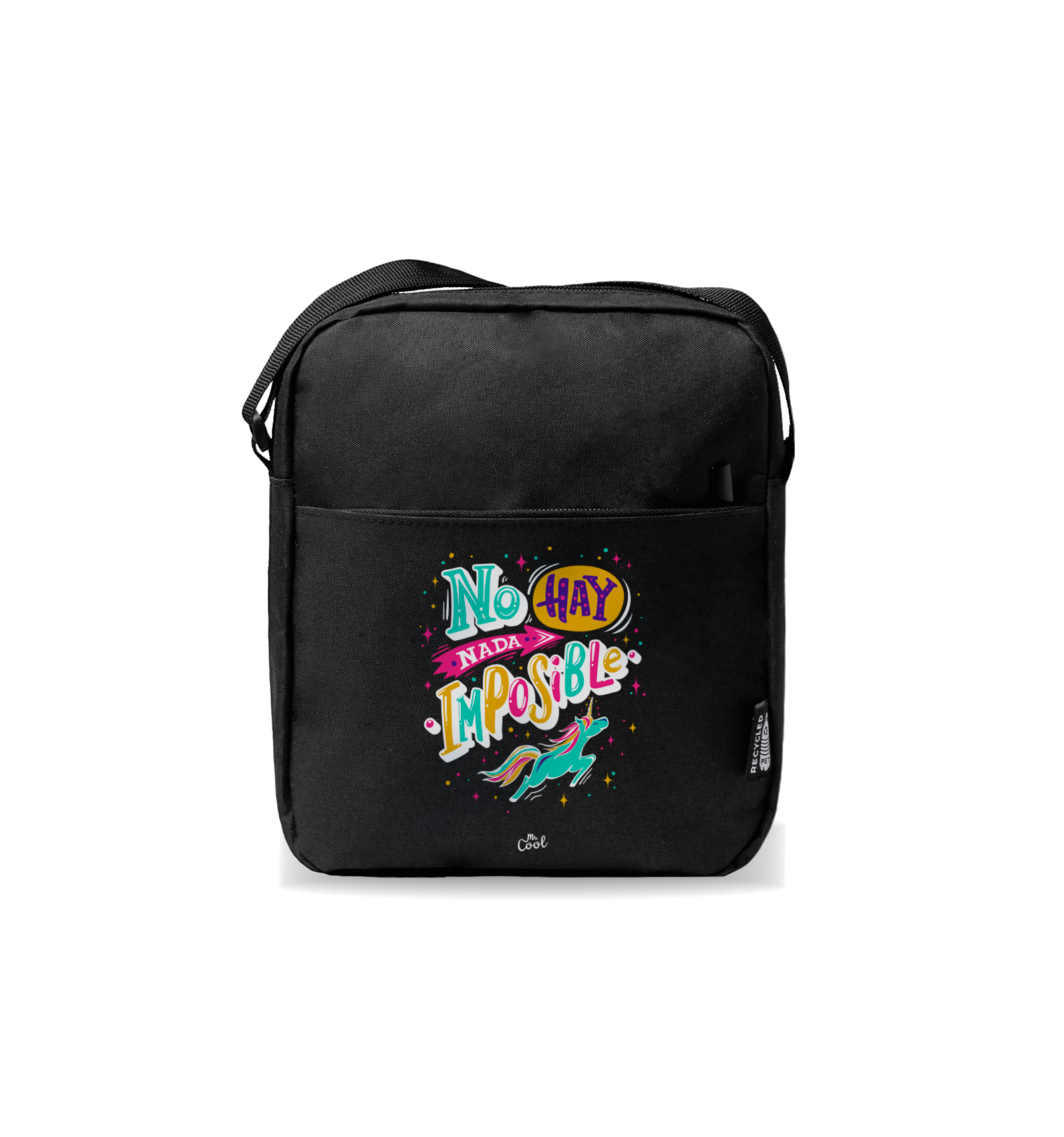 Bandolera negra con frases originales marca Mr. Cool, fabricada en políester reciclado RPET.