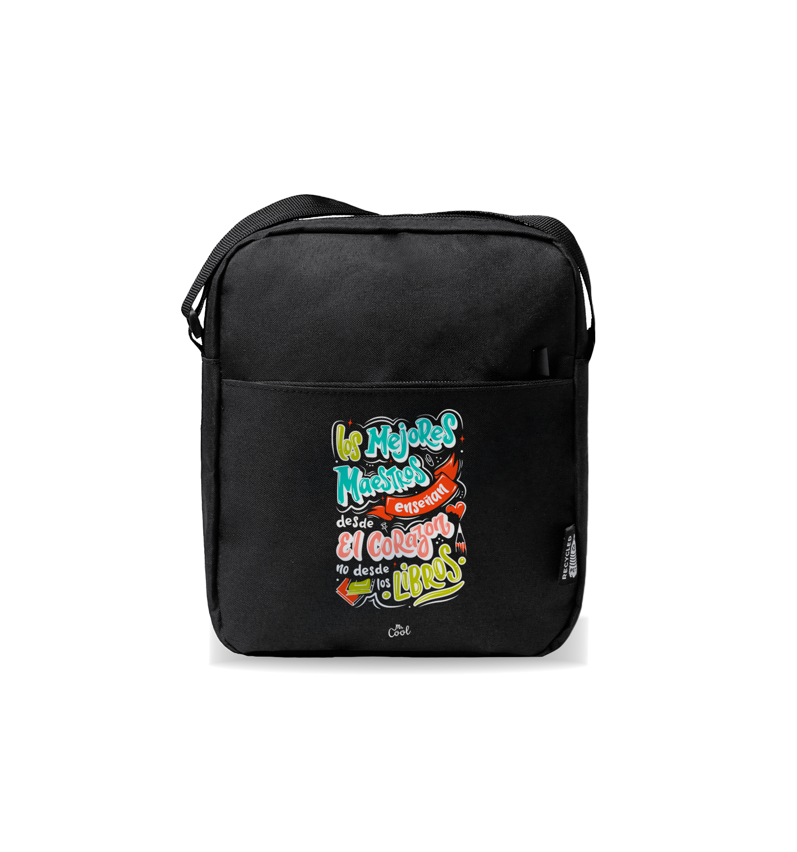 Bandolera negra con frases originales marca Mr. Cool, fabricada en políester reciclado RPET.